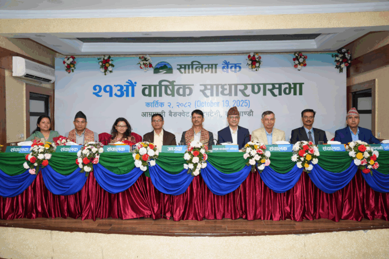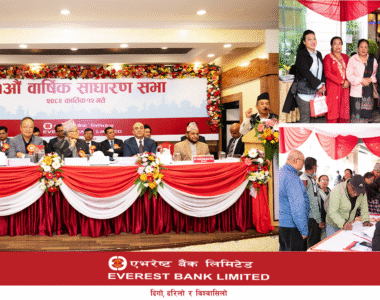 १२ कार्तिक, काठमाडौँ । काठमाडौं । एभरेष्ट बैंक लिमिटेडको ३१औं वार्षिक साधारणसभा सम्पन्न भएको छ । उक्त सभाले चुक्ता पूँजीको ६ प्रतिशत बोनस शेयर र १४ प्रतिशत नगद लाभांश (कर समेत) गरी कुल २० प्रतिशत लाभांश पारित गरेको छ । आर्थिक वर्ष२०८२/८३ को लागि जि पि राजवाहक एण्ड कम्पनीलाई लेखापरीक्षकमा नियुक्त गर्ने प्रस्ताव समेत सभाले […]