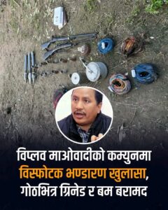नेत्रविक्रम चन्द ‘विप्लव’ नेतृत्वको नेपाल कम्युनिस्ट पार्टी (माओवादी) द्वारा सञ्चालन गरिएको अर्घाखाँचीस्थित कम्युनबाट ठूलो परिमाणमा विस्फोटक पदार्थ बरामद गरिएको छ।